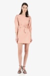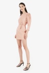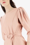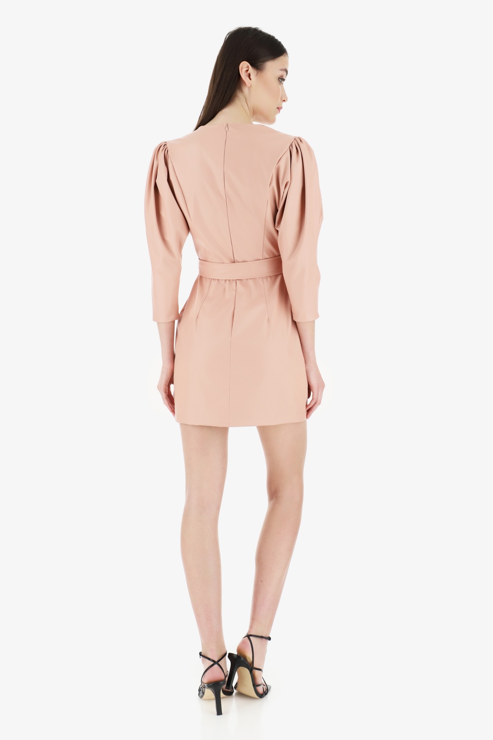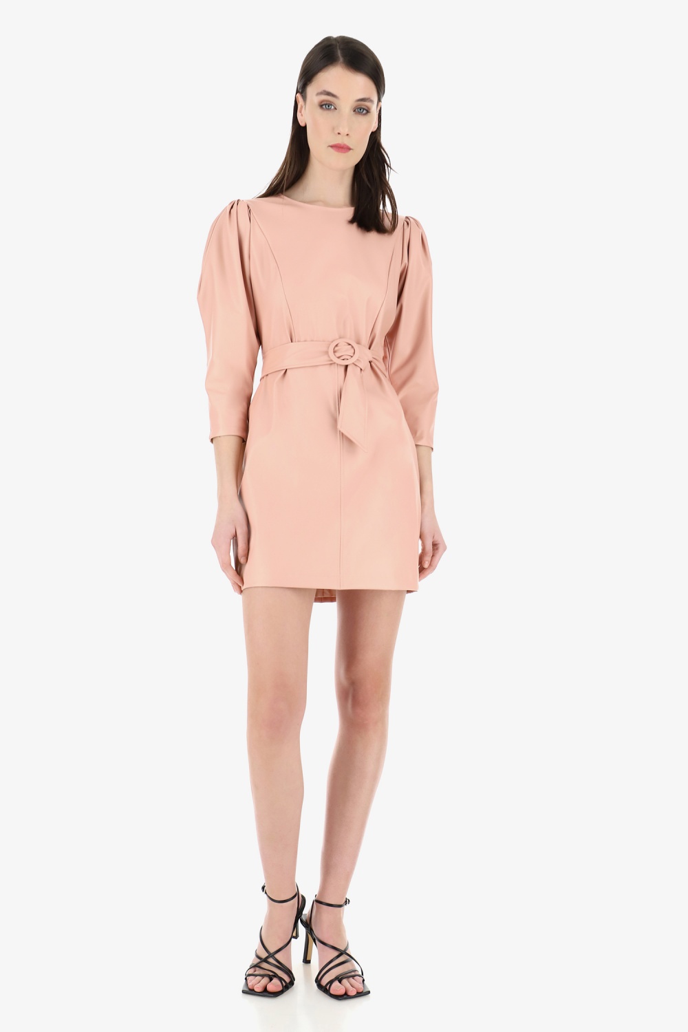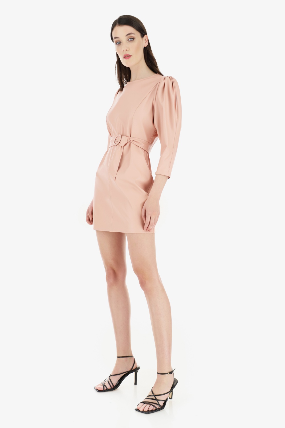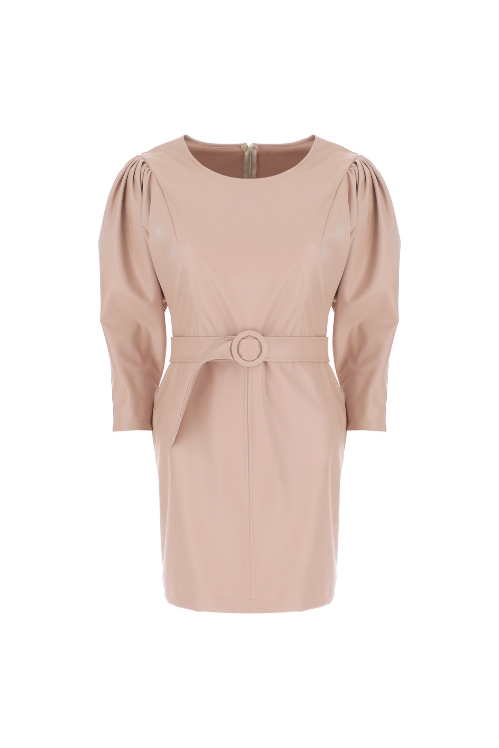 Kerek nyakú, puffos vállú mini műbőr ruha övvel