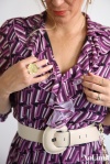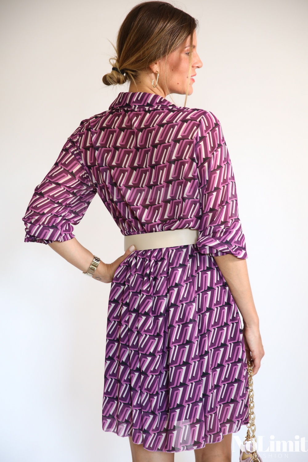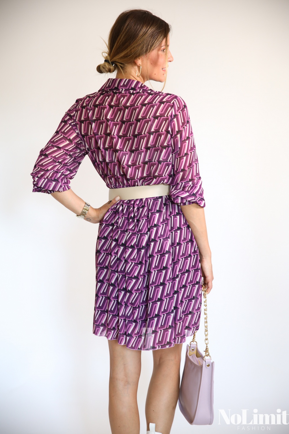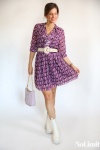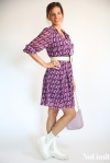 Fodros dekoltázsú, lila mintás, rövid ruha
