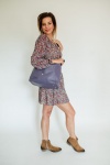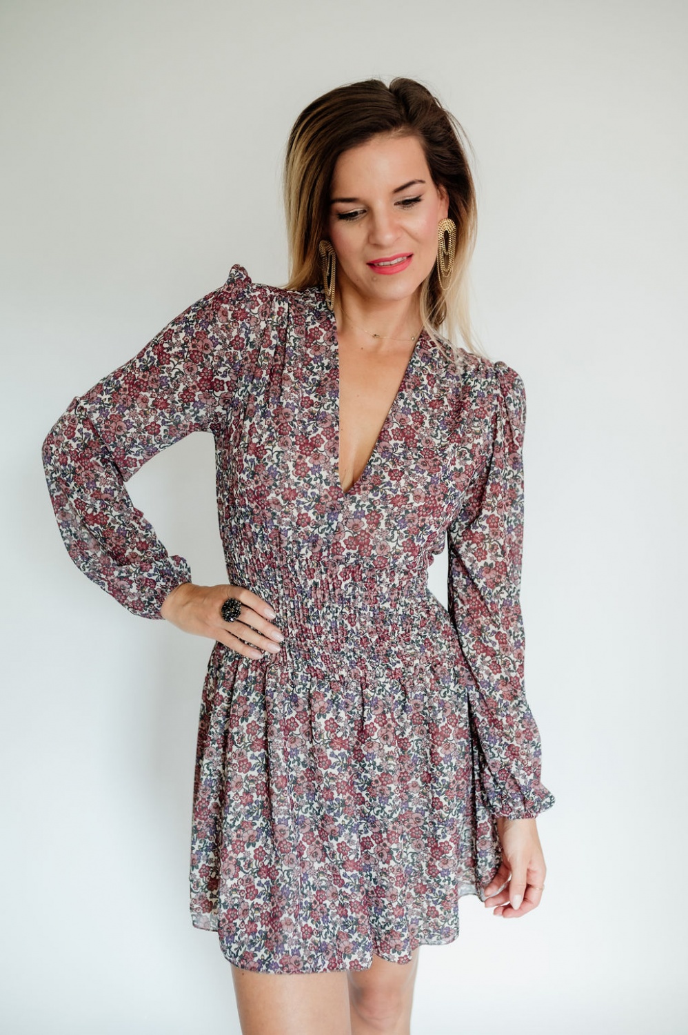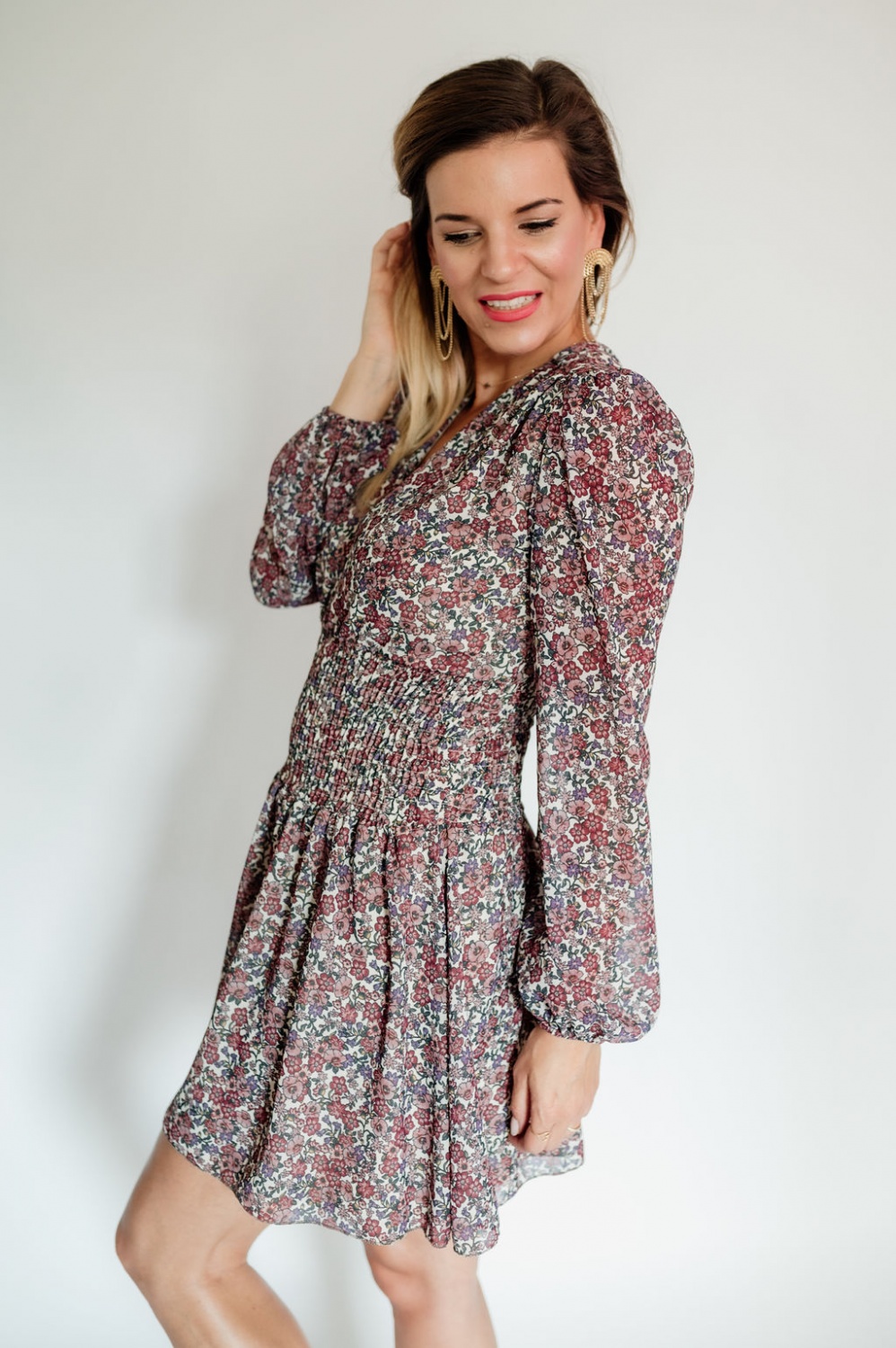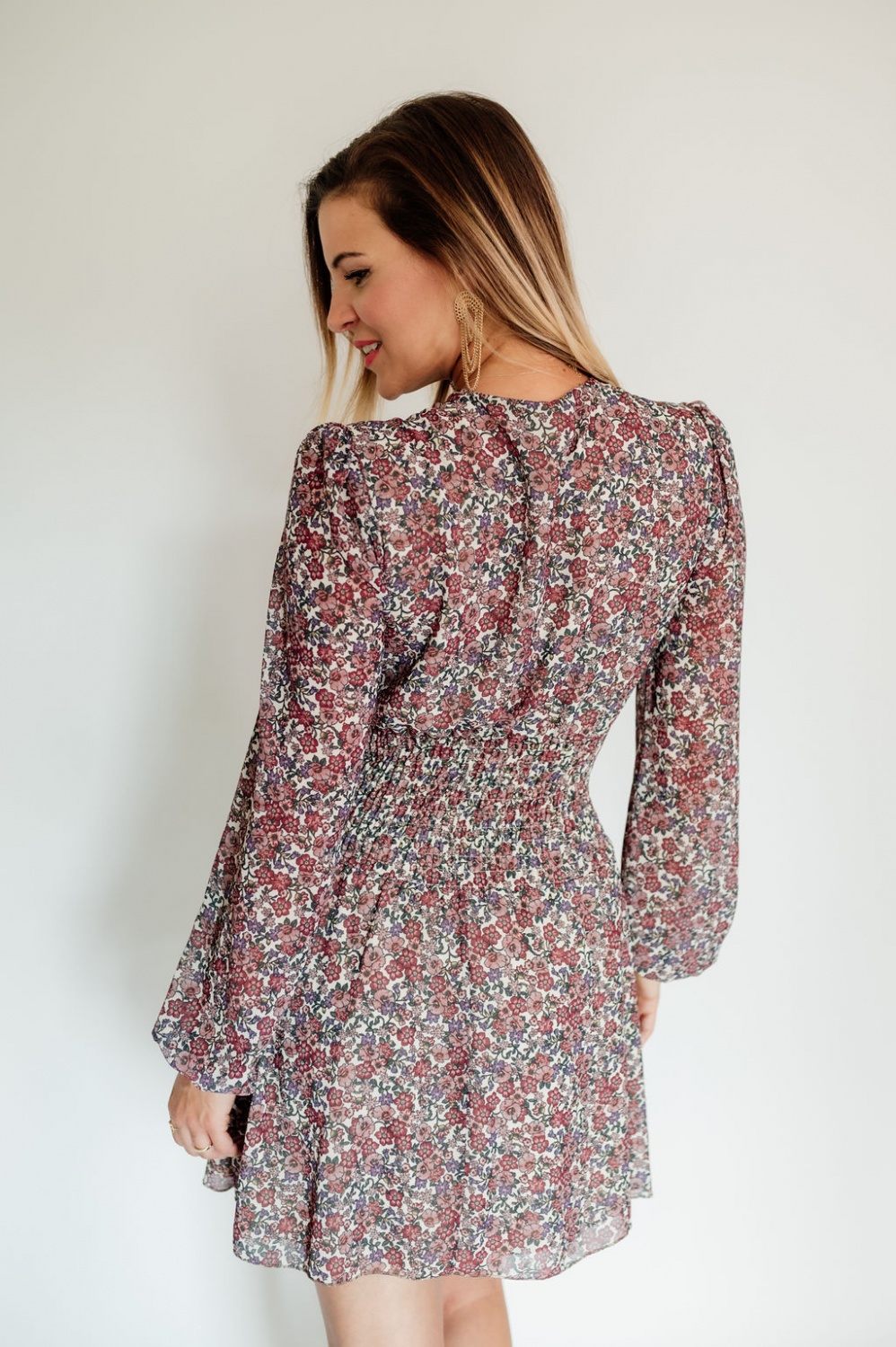 Húzott derekú, hosszú ujjú virágos mini ruha