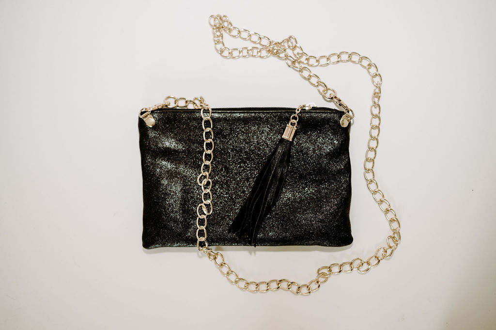 Kisméretű, fényes bőr laptáska, csatolható lánc vállpánttal, rojttal