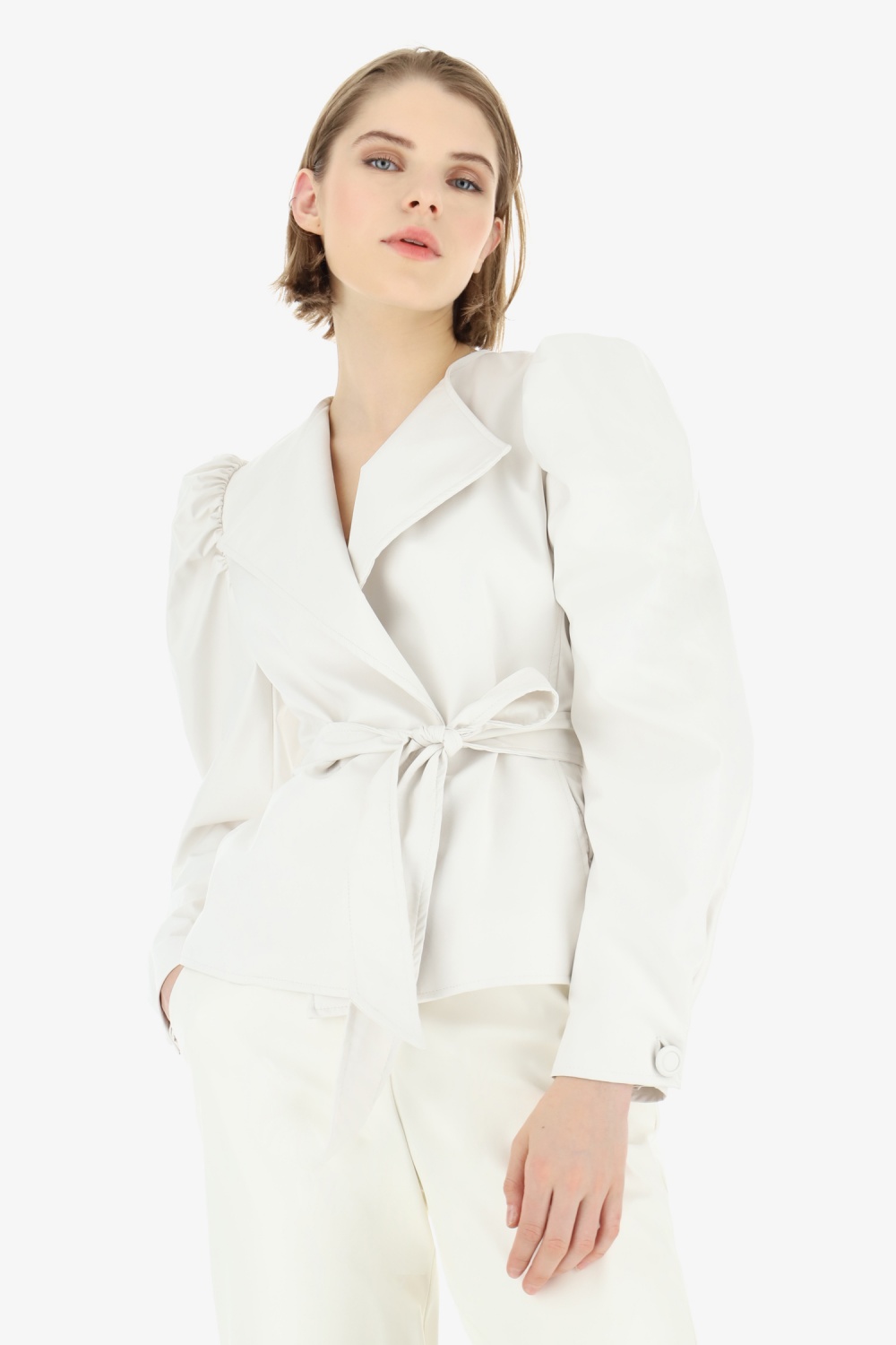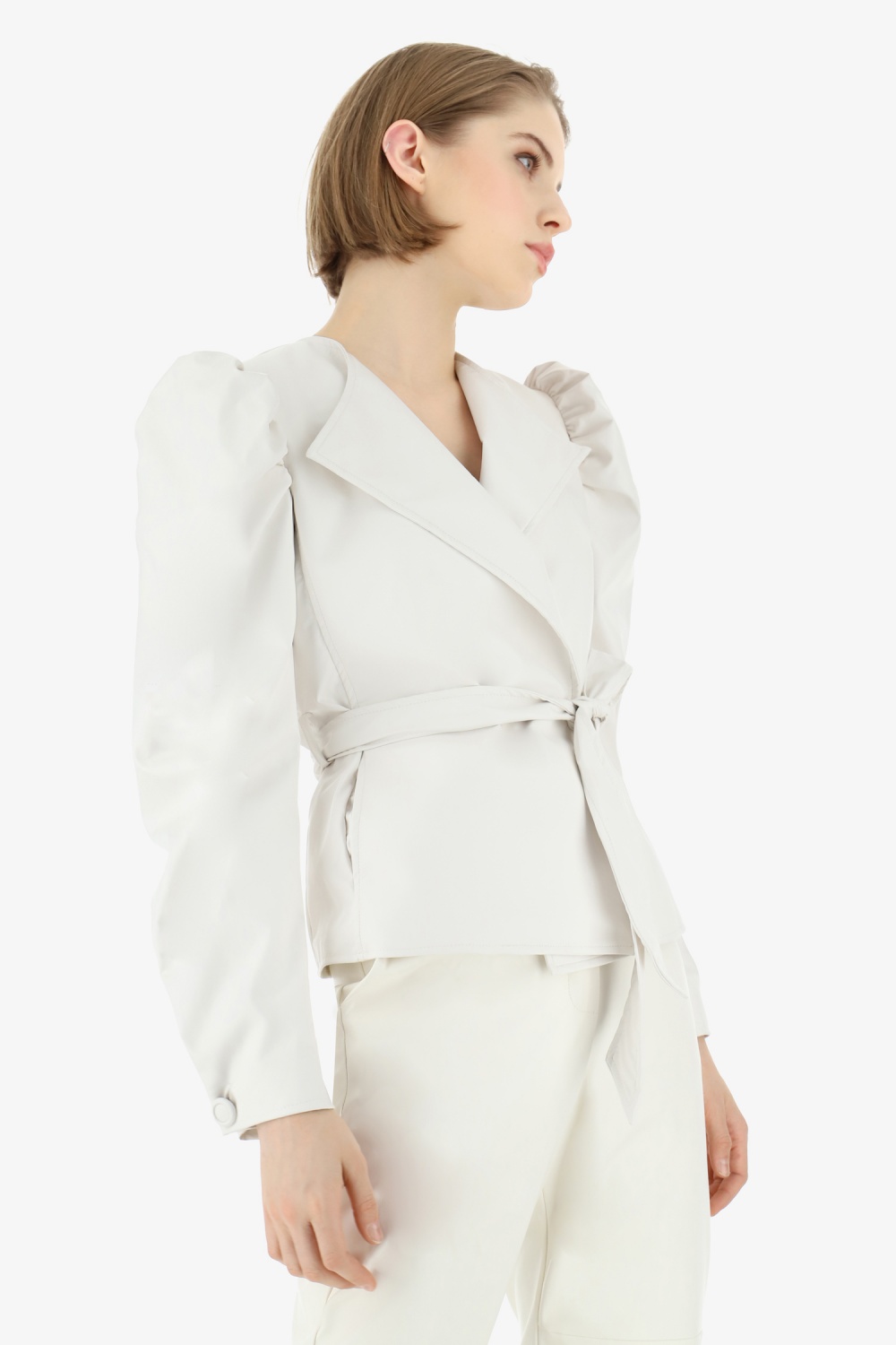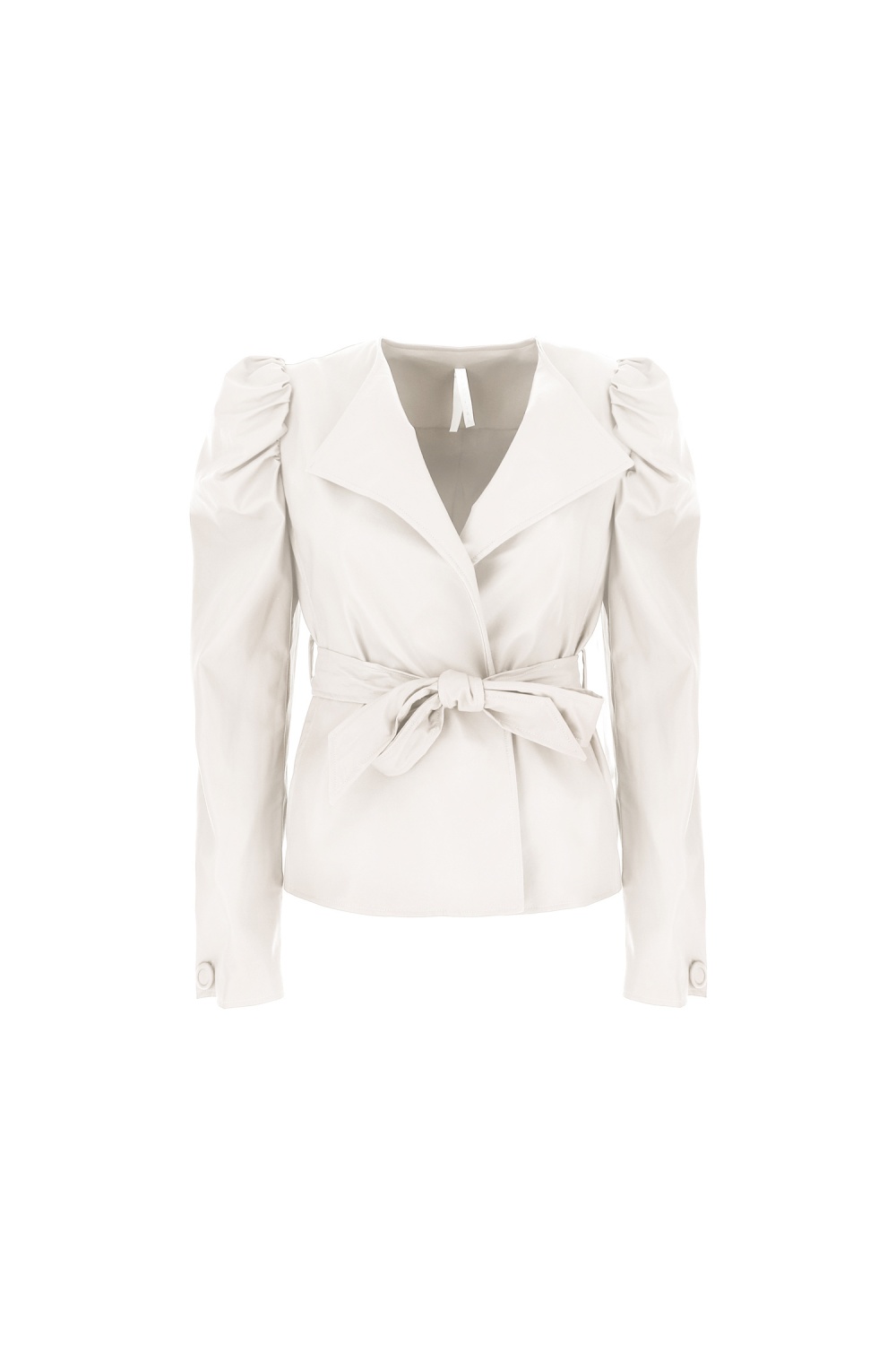 Puffos ujjú, megkötős műbőr kabát