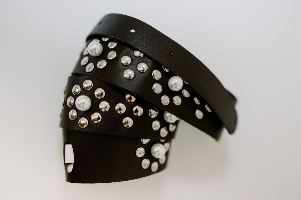 Szegecselt, gyöngyös bőr öv