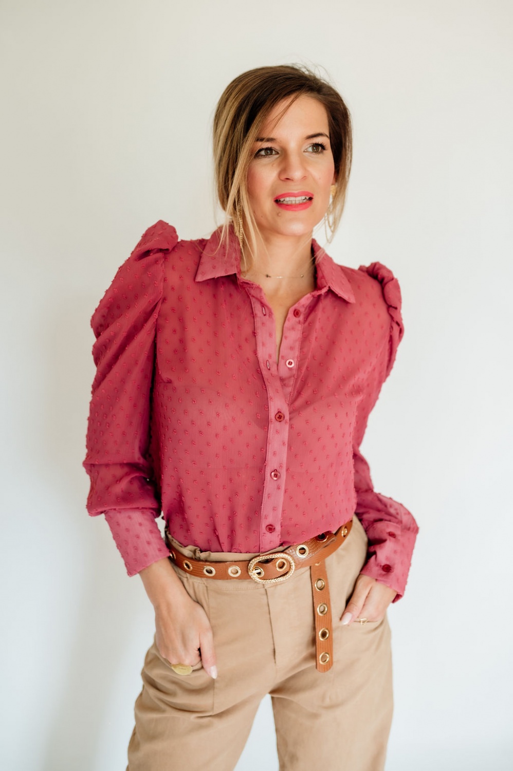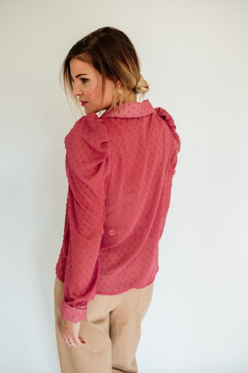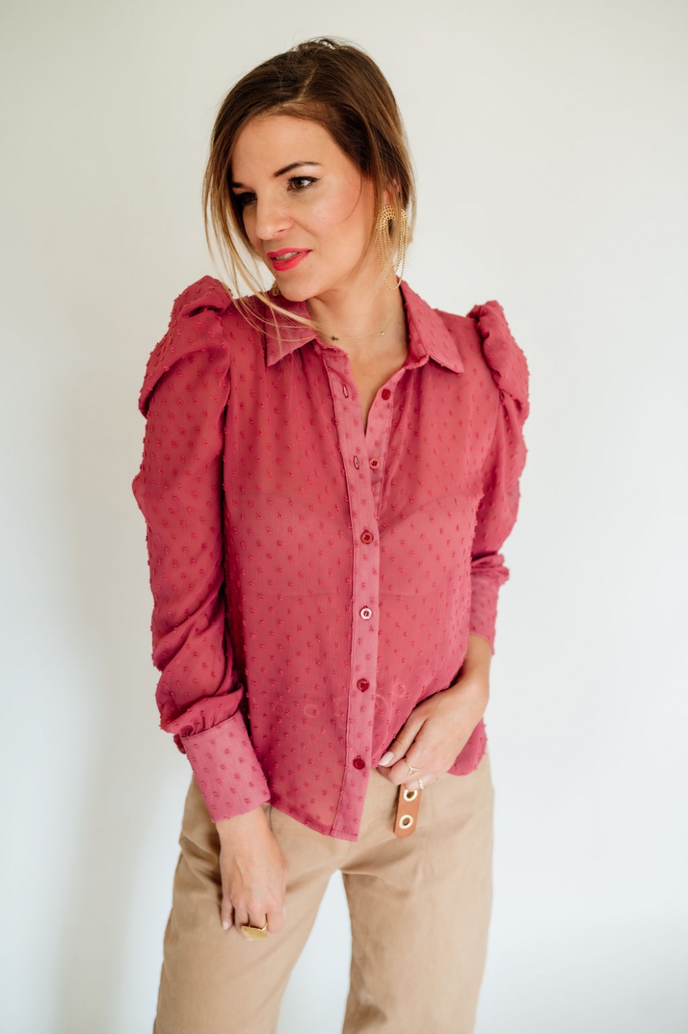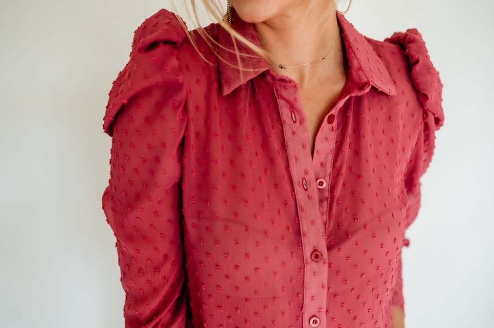 Tűpöttyös, húzott vállú blúz