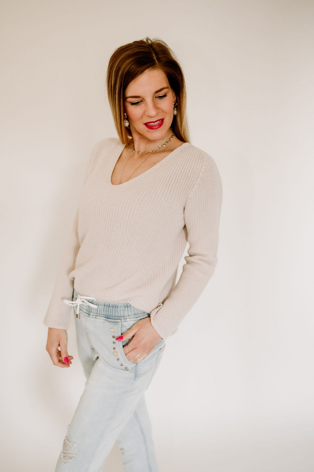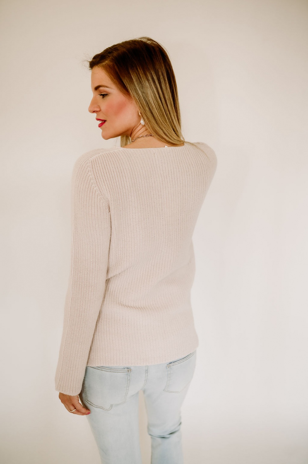 V-kivágott, hosszú ujjú, aszimmetrikus elejű kötött pulóver